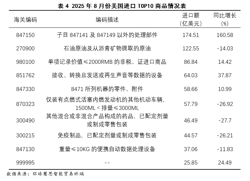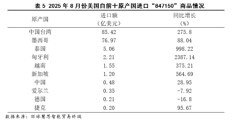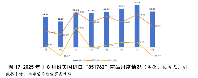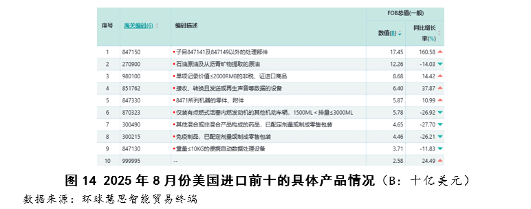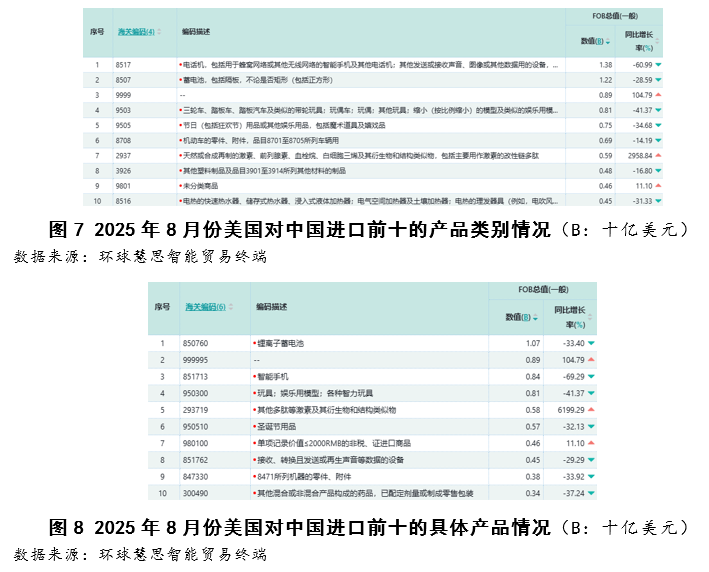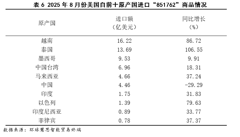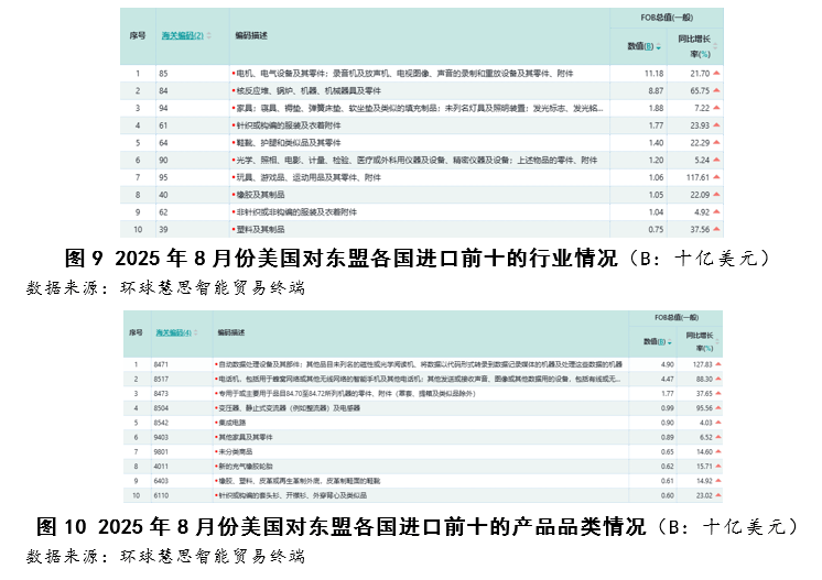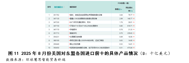 按照2025年8月份美国对东盟进口数据,其进口布局呈现手艺驱动型增加特征,次要增加动力高度集中于两大高手艺行业,“电机、电气设备及其零件”做为第一猛进口行业,其增加次要靠“德律风机及通信设备”品类驱动,该品类同比增加高达88。30%。正在商品层面,“数据通信设备”取“智妙手机”别离以79。77%取239。63%的同比增速成为焦点增加点,反映出美国对东盟正在通信终端取数据传输设备范畴的供应链依赖持续加深。(如图9至图11所示)