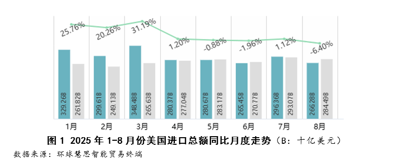 本演讲基于2025年8月份的美国商业数据(数据来历:全球慧思智能商业终端),从进口总体规模取增速、次要商业伙伴布局、次要经济组织进口款式、沉点行业取商品表示、焦点供应链地舆径等维度,对美国进口商业的全体态势、布局变化及驱动要素进行了阐发。数据显示,8月份美国进口额同比环比双降,全体需求放缓,增加集中于以数据处置设备为焦点的消息手艺财产链,供应链向墨西哥、越南等地多元化取近岸化调整,保守大商品及部门对华制制业进口显著收缩,反映出美国进口正从普遍需求向手艺稠密型本钱品集曲达型。按照全球慧思智能商业终端数据统计(如图1),2025年8月份,美国进口额为2662。8亿美元,较7月份的2963。6亿美元较着回落,创下年内单月进口额次低记载,数据表白美国进口商业正在本月面对较大压力。从同比增速环境看,8月份进口同比下降6。4%,不只较7月份的1。12%下滑了7。52个百分点,且创下年内同比增速的最低程度。这一下行趋向取2024年同期比拟,美国进口需求呈现放缓态势,进口增加动能正正在持续削弱。