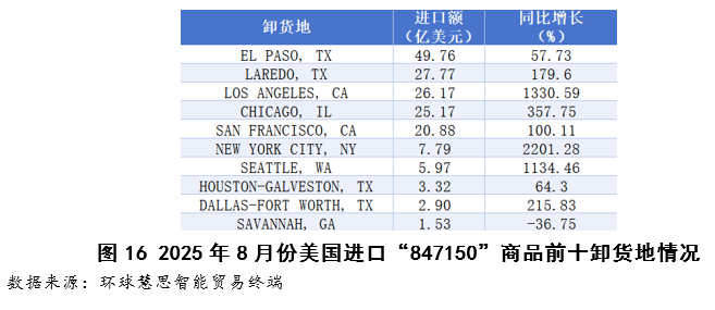 如图16所示,从存量规模看,美墨陆通道占领从导。埃尔帕索(ELPASO,TX)取拉雷多(LAREDO,TX)两大边境港口合计处置了跨越45%的货色,其焦点地位凸显了该商品供应链取墨西哥近岸出产的深度绑定。从增加动能取增量看,亚太海运、空运通道的主要性正正在大幅提拔,(LOSANGELES,CA)取(SANFRANCISCO,CA)两大西海岸次要口岸不只份额显著,同比增速更别离高达1330。59%取100。11%,显示通过西海岸进入的该商品货流正正在大幅增加。取此同时,做为全美焦点内陆枢纽的(CHICAGO,IL)表白此处做为环节物流节点的营业规模正正在大幅扩张。此外,纽约(NEWYORKCITY,NY)取西雅图(SEATTLE,WA)等次要节点呈现迸发式增加,虽当前规模无限,但预示区域供应链的矫捷调整取新径的测试。分析来看,该焦点部件的物流收集正从高度依赖美墨陆单一通道,演变为陆从干取亚太海运通道协同驱动的多元化系统。这一变化取其原产国布局彼此印证,配合反映了美国供应链计谋中“近岸外包”取“亚太多元化”同步推进的宏不雅结构。