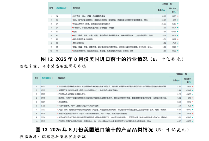取此构成明显对比的是,“车辆及其零件、附件”行业做为保守的进口支柱,其进口额为266。5亿美元,但同比显著下降16。57%,形成了次要的增加拖累项。这一行业层面的收缩可归因于其焦点形成部门的遍及下滑。具体来看,终端整车进口品类“次要用于载人的灵活车辆”进口额同比下降20。49%,是导致行业下行的首要要素;而做为供应链支持的“灵活车的零件、附件”品类进口额亦微降0。28%,正在反映出上逛配套需求的同步走弱的同时,也表白该行业下滑的布局性特征:最终消费品的需求收缩力度,弘远于做为两头品的零部件。(如图12至图14所示)从具体商品维度察看,“排量正在1500ML至3000ML的灵活车辆”虽仍以57。8亿美元的进口额位居商品榜第六位,但其所属品类全体大幅下滑,表白该细分市场仍保有可不雅的存量需求取进口规模;但其需求动能已大幅削弱,进一步印证了最终消费端的疲弱是导致行业进口额下降的次要缘由。(如图12至图14所示)2025年8月份,美国进口的宏不雅布局已清晰呈现出“增加集中于以数据处置设备为焦点的消息手艺财产链,而汽车、能源等保守大商品进口遍及收缩”的明显特征。